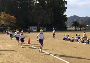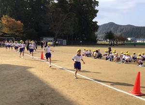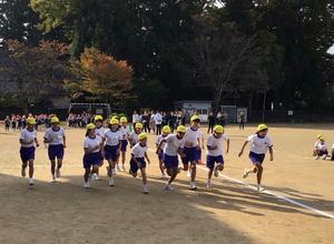 6年生の持久走チャレンジでは、終了のブザーが鳴るまで走り続けた姿。1年生の心にしっかりと届いたと思います。