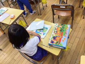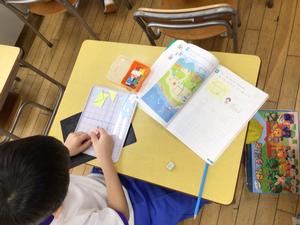 算数の授業をしていました。「かたちづくり」の単元でした。教科書の例題にある形を作るため、三角形の色板が必要か調べていました。