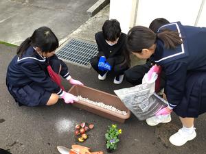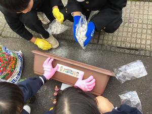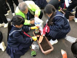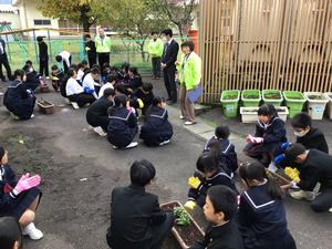 チューリップの花言葉は「思いやり」ビオラの花言葉は「信頼」ということだそうです。それぞれの班の植え方に特徴があります。これも個性ですね。人権教室、大変お世話になりました。