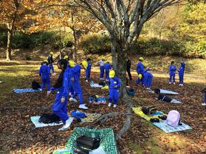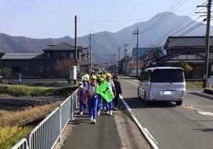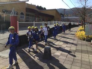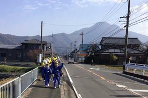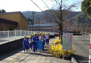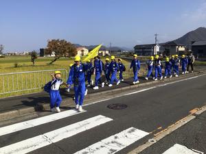 白崎公園から見た日野山は、紅葉で美しい姿でした。いよいよ、学校に向けて出発です。