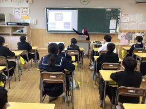 5年1組を対象に授業を行っていただきました。講師は、越前市でデザイナーをされている三木様です。身近にある看板のデザインをはじめ、壁画の装飾、服飾デザイン等、いろんな分野に携わっていることをスライドにして紹介してくださいました。