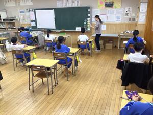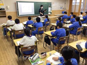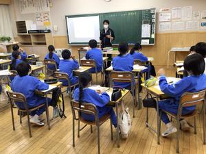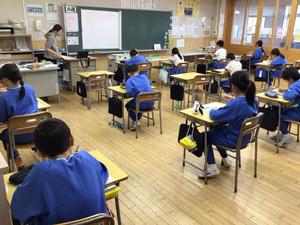 1組は、ニュース番組をつくるための情報収集という内容で社会の授業を進めていました。2組は、社会のテストに取り組んでいました。