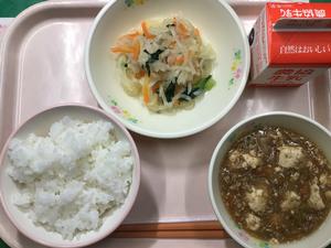 ご飯、牛乳、麻婆豆腐、大根のナムルでした。安心、安全な給食を作ってくださる調理員さん、ありがとうございます。