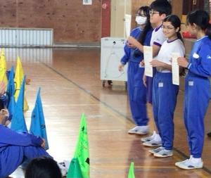 当日、児童会が箱の中にある数字を引きます。その数字に書かれたお題を班のみんなで達成することで、その数字をゲットすることができます。一番最初に引かれた数字は「7」・・班のみんなが一人ずつジャンプするというお題でした。それぞれの班では、順番に一回ずつジャンプしてクリアしていました。判定は、それぞれの班を指導する先生方です。