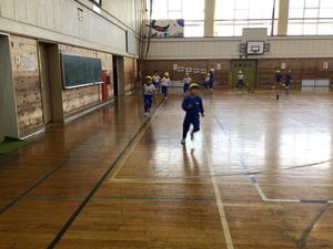 しっかり準備体操をしました。けれど、とても寒いです。少し体温を上げようということで、制限時間を設けてランニングをしました。合図とともに走り出したのですが、1番になりたい児童がいっぱいです。みんなトップスピードで周回を重ねていました。