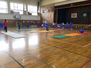 体育の授業をしていました。なわとびを使って持久跳びの後、マット運動に取り組んでいました。