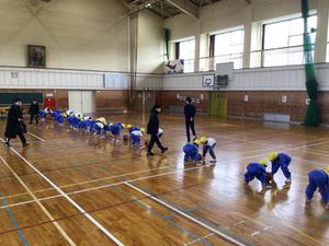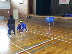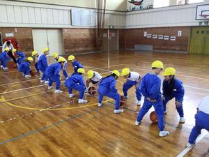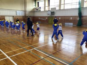 ウォーミングアップの様子です。二人一組、向かい合った中央にボールを置きます。コーチの方の指示を聞きます。「頭」→頭に手をもっていきます。「肩」→肩に手をもっていきます。「膝、つま先、かかと・・」いろんな場所を指示されます。その指示に合わせて手をもっていきます。「ボール!」の指示を聞いたら、お互い向き合った中央にあるボールを取りました。みんな集中して楽しく取り組んでいました。