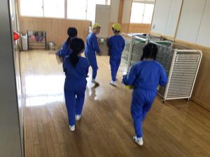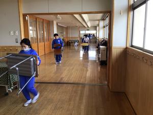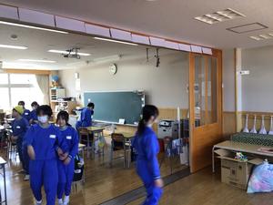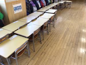 人数の増減に合わせ、移動対象の机や椅子が廊下に出されました。高学年は、移動先の教室に運んでくれました。