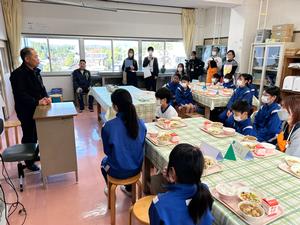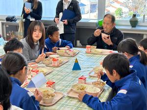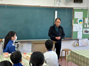 今日から1週間、給食のご飯がコウノトリ米になります。コウノトリを呼び戻す農法部会長さんから、コウノトリ米はコウノトリを呼び戻し安全・安心で美味しい米を育むことを目指して、農薬や化学肥料を一切使わず、生き物との共生に配慮して作られていると説明を受けました。説明の後、会長さんと一緒にコウノトリ米の給食を食べました。コウノトリ米は、香りも味も美味しいし、環境にもいいのですごいと思いました。