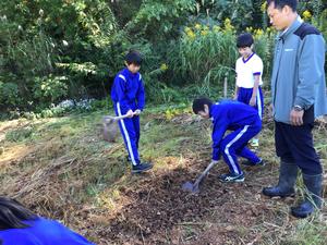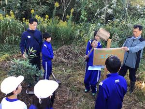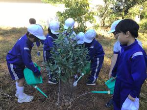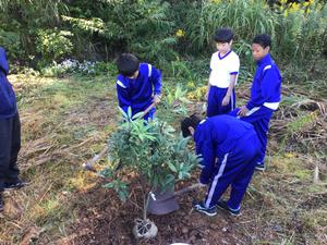1~6年生で幼稚園の横にユズリハを植樹しました。ユズリハの葉は毎年、しめ縄作りで使っています。今回植えたユズリハが大きくなって、しめ縄作りに使えるようになりますように。近くにアケビを見つけたので、取って食べてみました。