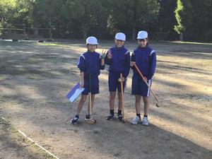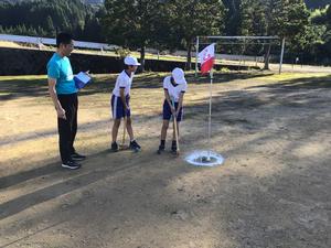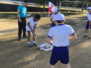 4~6年生はクラブでグランドゴルフをしました。少ない打数で旗の音を鳴らすのが目標です。最初は力加減が分からず玉が思った場所に飛びませんでしたが、だんだん慣れてきて思ったように打てるようになって短い打数で音を鳴らすことができました。