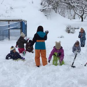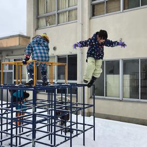 1~3年生は2時間目に校舎裏とハッピー山で雪遊びをしました。ジャングルジムからジャンプしたり、ソリをしたり、滑り台をしたり、雪合戦したり、雪を楽しみました。