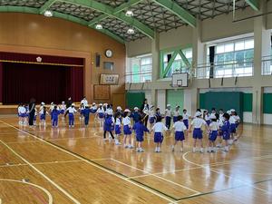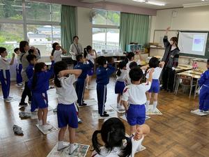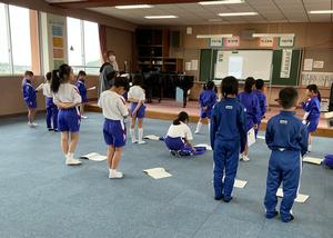 そして、4月27日は、神山小学校での第1回目の交流会。各学年の教室では自己紹介やゲームをしました。学校探検をしている学年もありました。音楽の授業では、それぞれの学校で練習していった曲を一緒に歌ったり、演奏したりしました。体育館では、2学年合同で、チームで協力して輪っかくぐりをしたり、じゃんけんピラミッドをしたりしました。