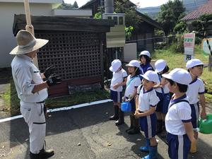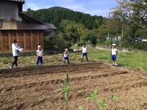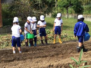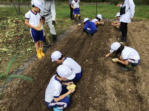 3時間目に1・2年生はサツマイモを掘った畑の後に用務員さんに教えてもらいながら大根と蕪の種を植えました。一列に二粒ずつ10cm間隔で小さい種を植えていきました。ジョウロで水をかけて、大きく育つように声援を送りました。