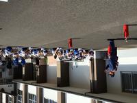 地震と火災を想定した避難訓練を行いました。子ども達は、緊急放送を聞いて、机の下にもぐる、静かに避難する等、自分の命を守る行動を意識して訓練に参加することができました。消防署の方の話を聞いた後、消化器の使い方を教わり、水消化器で訓練しました。