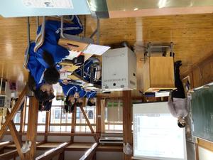 算数で、分母が同じ分数の計算をしています。今日は、帯分数が混ざった式の計算方法を考えました。仮分数にして計算する、整数はちょっと置いておいて、分数だけ計算するなどいくつかの考えが出ました。いろいろな方法で計算して、分数のしくみをより理解することができました。
