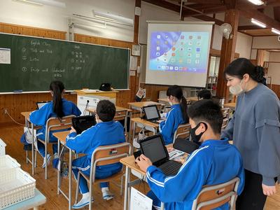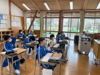 6年生は英語のデジタル教科書をセットアップしているところです。5年生は好きな動物をたずね合うために動物の名前を読む練習していました。