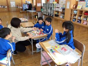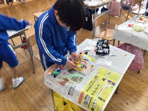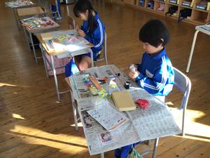 紙粘土を使って、ごちそうを作りました。絵の具をちょっとずつ紙粘土に混ぜ、作りたい物に合う色にしてから、形を作りました。たらこスパゲティ、たまごやき、たこさんウインナーなど、お弁当箱の中には、おいしそうなごちそうがたくさんできました。