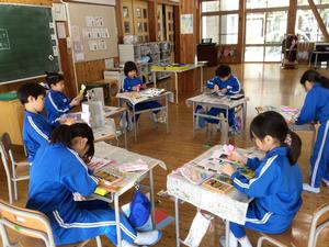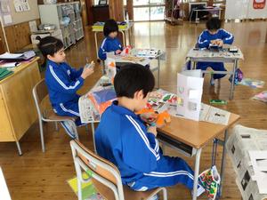 紙に四角や丸の窓を開け、見える物をつけたり、模様を描いたりして、楽しい建物をつくりました。
