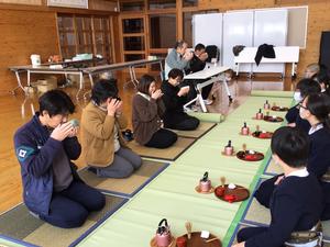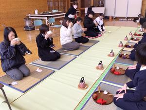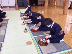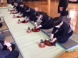 前回と今日のクラブでは、先生方を招待し、お点前を披露しました。これまでの練習を思い出しながら、お点前の所作や帛紗さばきなどに落ち着いて取り組むことができました。お茶の先生からもほめていただきました。
