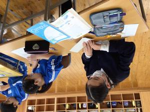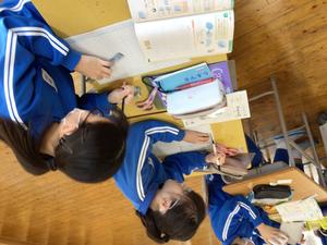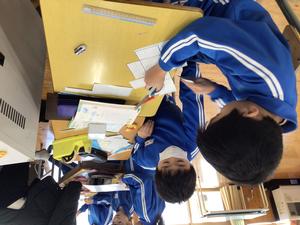 直方体の展開図をかき、直方体を作りました。展開図をかくのは初めてなので、面の数や形、配置をよく考えながら気をつけてかきました。切り取った展開図が直方体になると、「できた!」と喜んでいた子どもたちです。