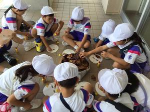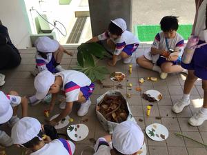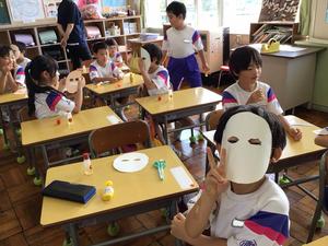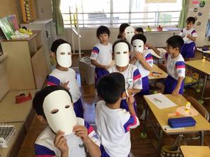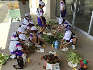 今日の生活の時間は、秋の落ち葉を使ってお面づくりをしました。