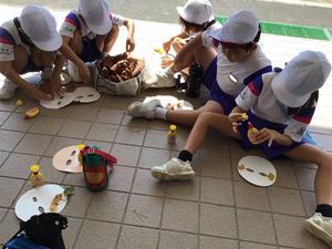 はじめに、画用紙でお面を作り、そこにボンドで落ち葉をつけて飾り付けをしていきました。
