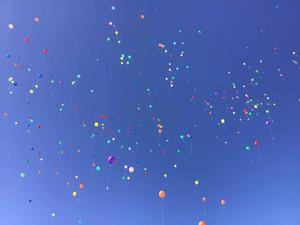 到着を待つ間もドキドキ!風船がからまるトラブルを何とか乗り越えて、無事バルーンリリースをすることができました。秋晴れの澄んだ空に色とりどりの風船が飛んでいく景色は、想像していたよりもキレイで、大歓声があがりました。