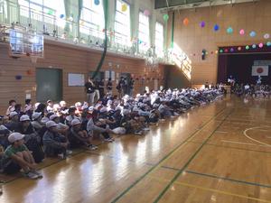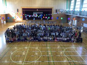 その後は体育館での対面式。保護者のみなさんに飾り付けていただいたすてきな空間で、越前市の素晴らしさを伝える劇も披露することができました。また、参加してくださった全員での写真撮影もすることができました。