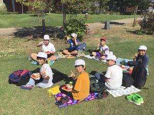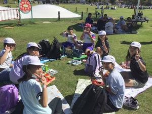 武生中央公園では、グループの友達と一緒にお弁当を食べ、その後は公園で遊んだり、遊具に乗ったりしました。いつも行き慣れている場所ですが、積志小学校の友達と一緒だと、何だか特別に感じます。
