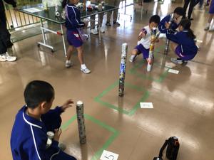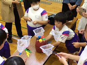 1校時終了後には父母と先生の会主催の「VS東ミニ」が行われました。縦割り班ごとに空き缶積みやスカットボールなどのいろいろなゲームに歓声を上げながら楽しんでいました。