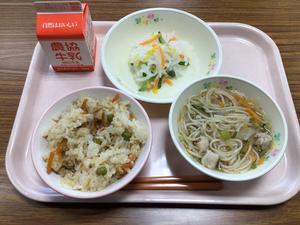 この献立には、越前市産のきゅうり・小松菜・菊など、地元の食材がふんだんに使われています。メニューは「油揚げご飯」「麦とろ麺のすまし汁」「大根の菊花和え」「牛乳」と、栄養バランスにも配慮された内容です。