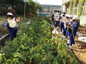 国語で「すがたをかえる大豆」の学習を終えた子供たちは、「葉が落ちて茶色く枯れてから収穫するんだよ!」と収穫を楽しみにしています。