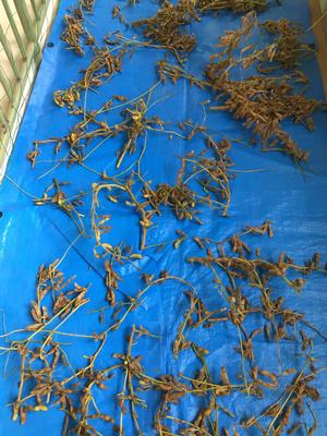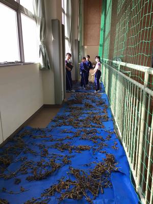 地域の方々にサポートしていただきながら、たくさんのダイズが収穫できました。収穫後は葉と根を落として、ブルーシートの上でしばらく乾燥させることにしました。乾燥後は、いよいよ豆を取り出す作業です。