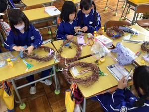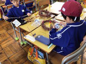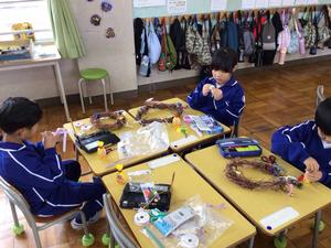 リースは、育てていた朝顔のつるから作りました。どんぐりや松ぼっくり、リボンやモールを使って飾り付けをしました。友達と協力してリボン結びをしたり、ボンドで飾りをつけたり、みんな黙々と作業をしていました。