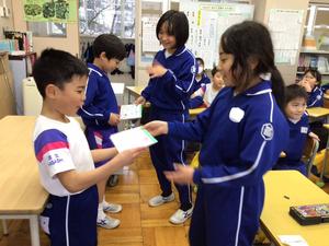 最後はお誕生日係から2月生まれの友だちにバースデーカードのプレゼントをしました。一人一人に合わせた素敵なデザインで、もらった2人も嬉しそうでした。