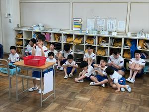 4月の発育測定は異学年交流活動の一環として二つの学年が合同で行なっています。今日は6年生が1年生の測定をサポートしました。