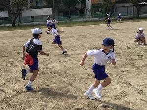 大休みになると、急いで児童が校庭に出てきました。ハンター(鬼)に捕まらないように、必死で逃げていました。捕まっても、早口言葉を言い切れば、戻ることができるという救済措置があり、ずっと楽しめる内容でした。たくさん走っていい汗をかいていましたね。