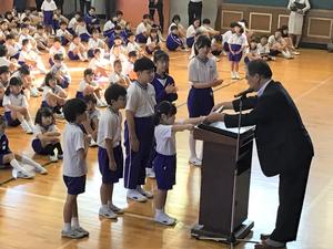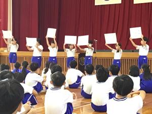 児童朝会の前に、青少年育成標語の表彰がありました。西地区自治振興会長から入賞者に、賞状と副賞が授与されました。最優秀賞の6年生の標語は、横断幕となって貼り出される予定です。