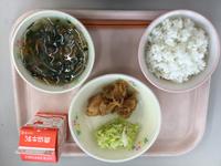 3学期最初の給食は、ごはん、牛乳、揚げ鶏のゆず風味、ボイルキャベツ、七草汁でした。