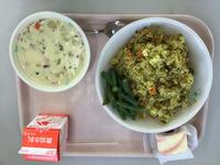 カレーピラフ、牛乳、ボイルいんげん、打ち豆入りコーンポタージュ、お祝いデザートでした。