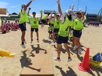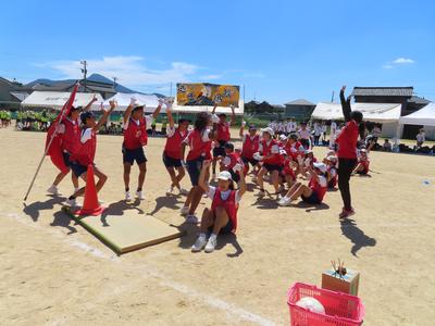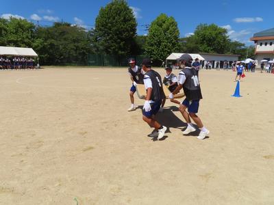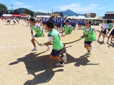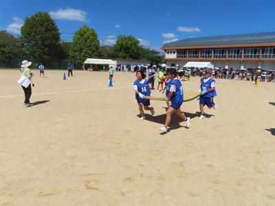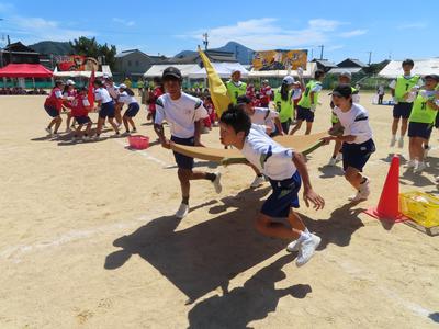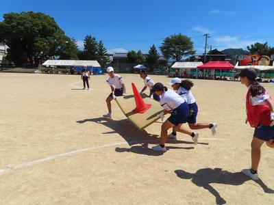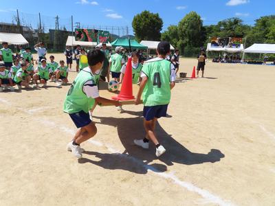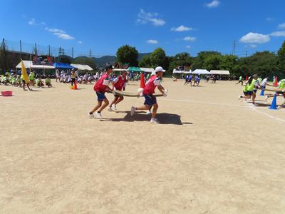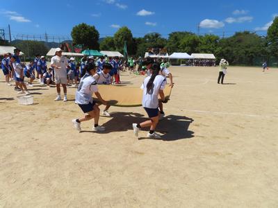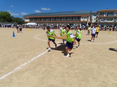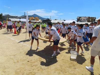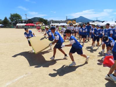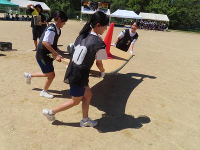 2年生の学年種目は「Uber Itchu」です。4人で畳をもち、8の字のコースを走りました。くじの内容によって畳に乗せるものが変わり、ボールとカラーコーンを乗せなければならない時が一番苦労していましたが、4人で協力してゴールを目指しました。