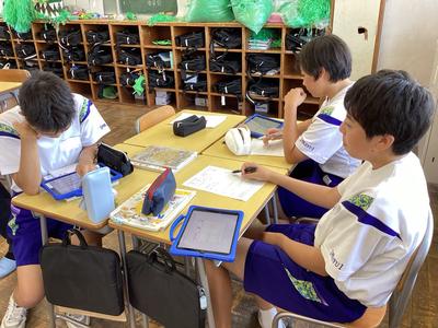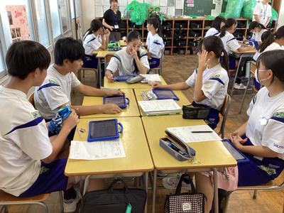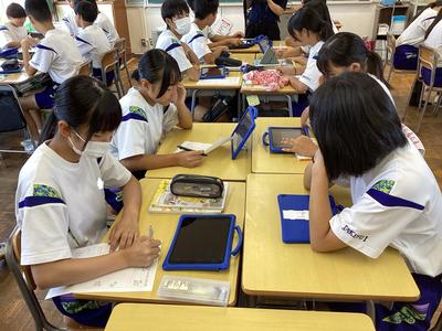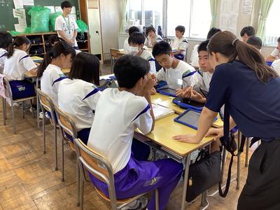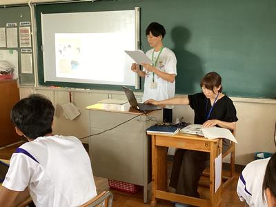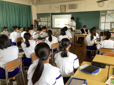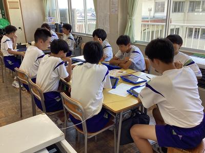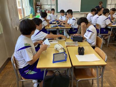 3年6組の家庭科の様子です。「幼児との触れ合い体験」の振り返りを行いました。越前市の職員の方とにじいろこども園の職員の方にも来ていただき、保育士の魅力など保育士の仕事についてのお話をしていただきました。
