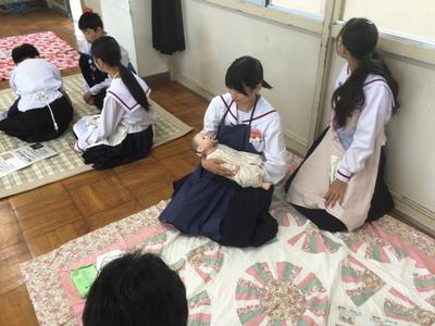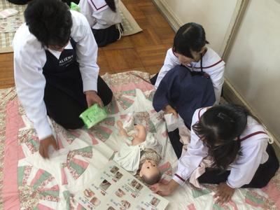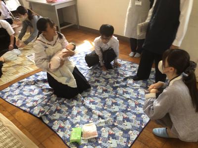 22日(月)に、市健康増進課と赤ちゃん抱っこ隊の方を講師にお招きし、赤ちゃん人形抱っこ体験を行いました。最初に、赤ちゃんの抱っこの仕方やおむつのかえ方についての説明を聞きました。次に、赤ちゃん人形を抱っこしたり、おむつをかえたりしました。貴重な体験をすることができました。講師の先生方、ありがとうございました。