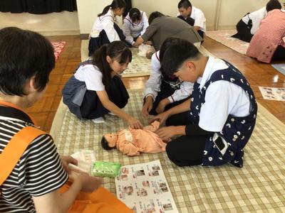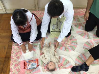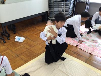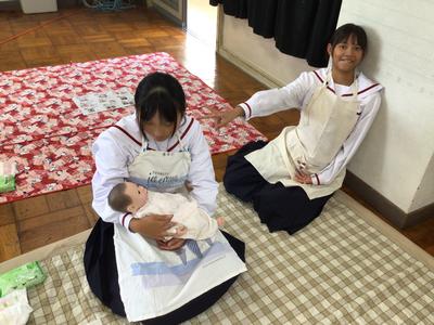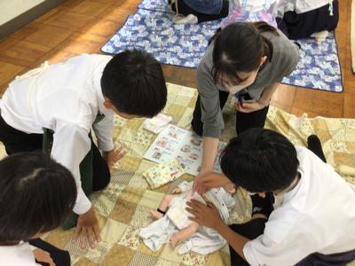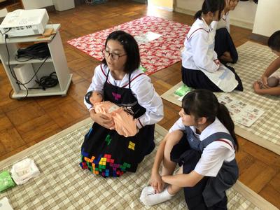 22日(月)に、市健康増進課と赤ちゃん抱っこ隊の方を講師にお招きし、赤ちゃん人形抱っこ体験を行いました。最初に、赤ちゃんの抱っこの仕方やおむつのかえ方についての説明を聞きました。次に、赤ちゃん人形を抱っこしたり、おむつをかえたりしました。貴重な体験をすることができました。講師の先生方、ありがとうございました。