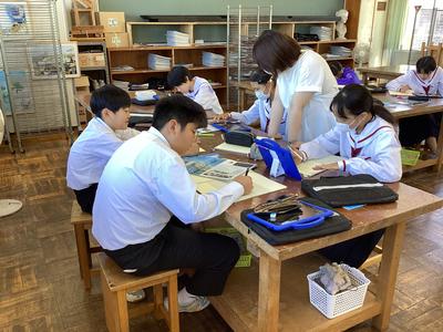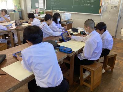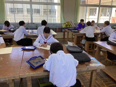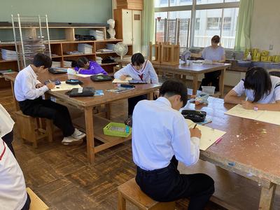 1年2組の美術の様子です。絵と文字を組み合わせた面白絵文字をデザインしました。子どもたちのアイディアは凄いです。