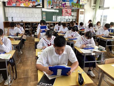 3年5組の社会科の様子です。「日本において基本的人権の尊重は達成されているのだろうか」というテーマでレポートを作成しました。引用する資料は自分で探すなど考えて仕上げています。