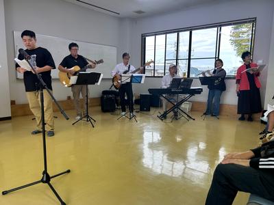 19日(日)に、芝原ふれあい会館で「芝原5丁目秋祭り」が行われ、合唱部が芝原5丁目メモリアルバンドとジョイントコンサートを行いました。「我らがふるさと芝原」と題して、楽しい雰囲気の中で7曲を歌いました。皆さんの笑顔が印象的でした。