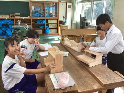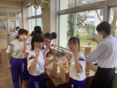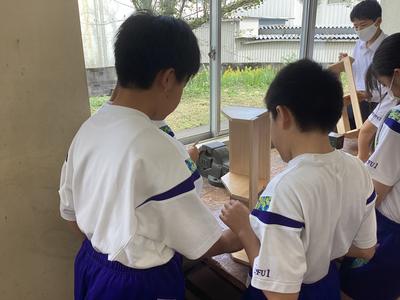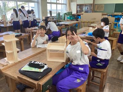1年1組の技術の様子です。ブックスタンドやコーナーラックなど自分の用途に合わせて木工作品を製作しました。