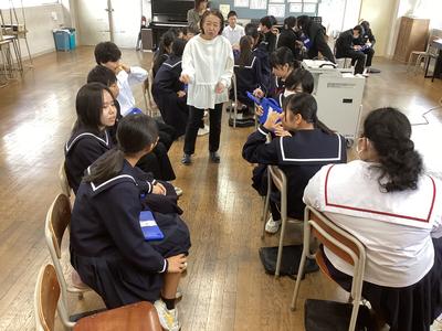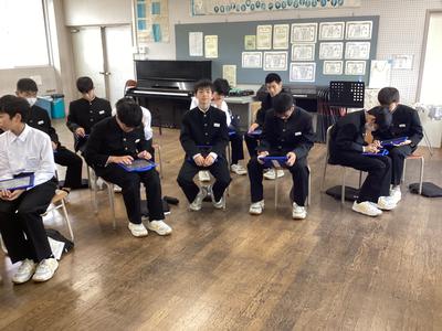 1年4組の音楽の様子です。合唱コンクールで歌う「カリブ夢の旅」の練習をしました。楽譜に書かれている記号の意味について考えました。